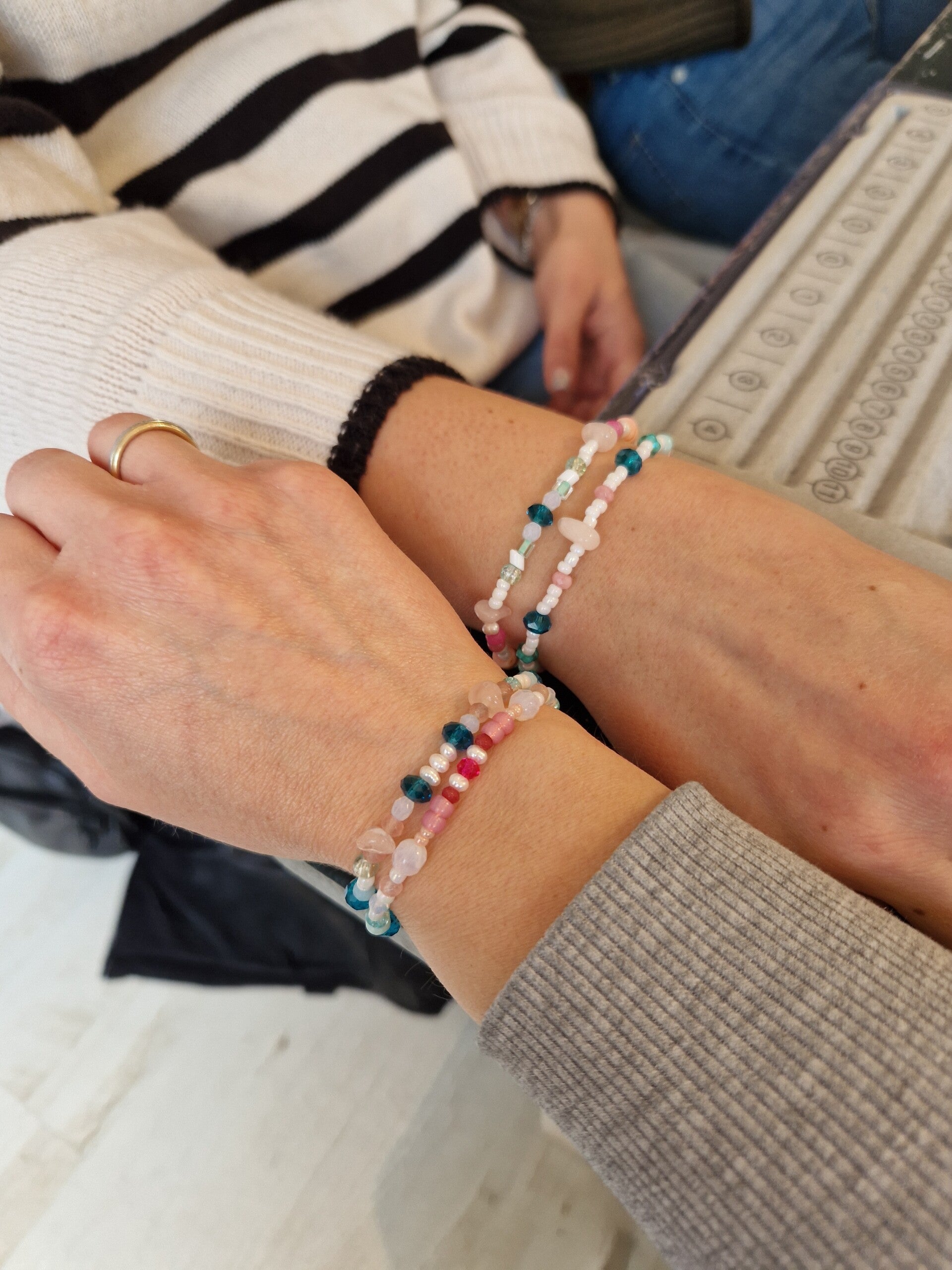 Ich weiß noch genau, wie ich den Workshop-Raum betrat. Überall standen kleine Gläschen, Schälchen und Boxen voller Perlen. Schimmerndes Süßwasser, bunte Glasperlen, matte Edelsteine... Es war ein einziger Rausch aus Farben und Formen.