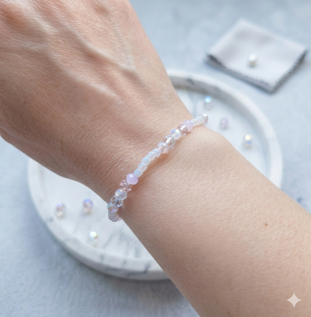 Sanft schimmernde Perlen bilden die Basis und werden durch funkelnde Glasperlen in warmen Rosé- und Champagnertönen ergänzt. Für ein wenig Lichtreflexion sorgen die eingearbeiteten Kristalle mit kleinen rosafarbenen Akzentsteinen.