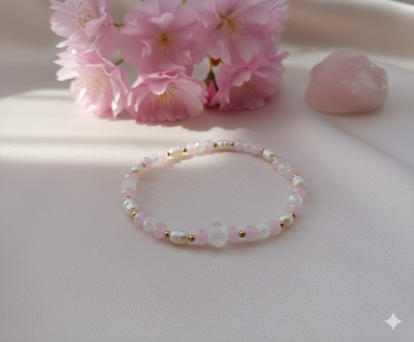 Dein Set enthält zart roséfarbene, facettierte Glasperlen, unregelmäßige Süßwasserperlen und feine goldfarbenen Akzente. Die sanften Farbtöne und die Perlen erinnern an Carries ikonischen Mix aus Romantik und Selbstbewusstsein.