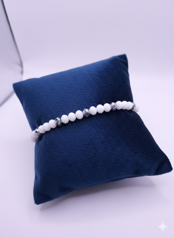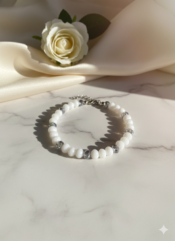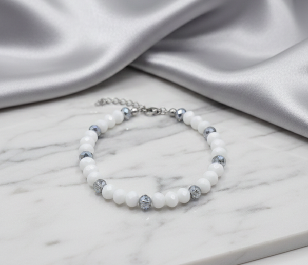 - Design: Sanft schimmernde, mattweiße Perlen treffen auf metallisch glänzende, facettierte Akzente.