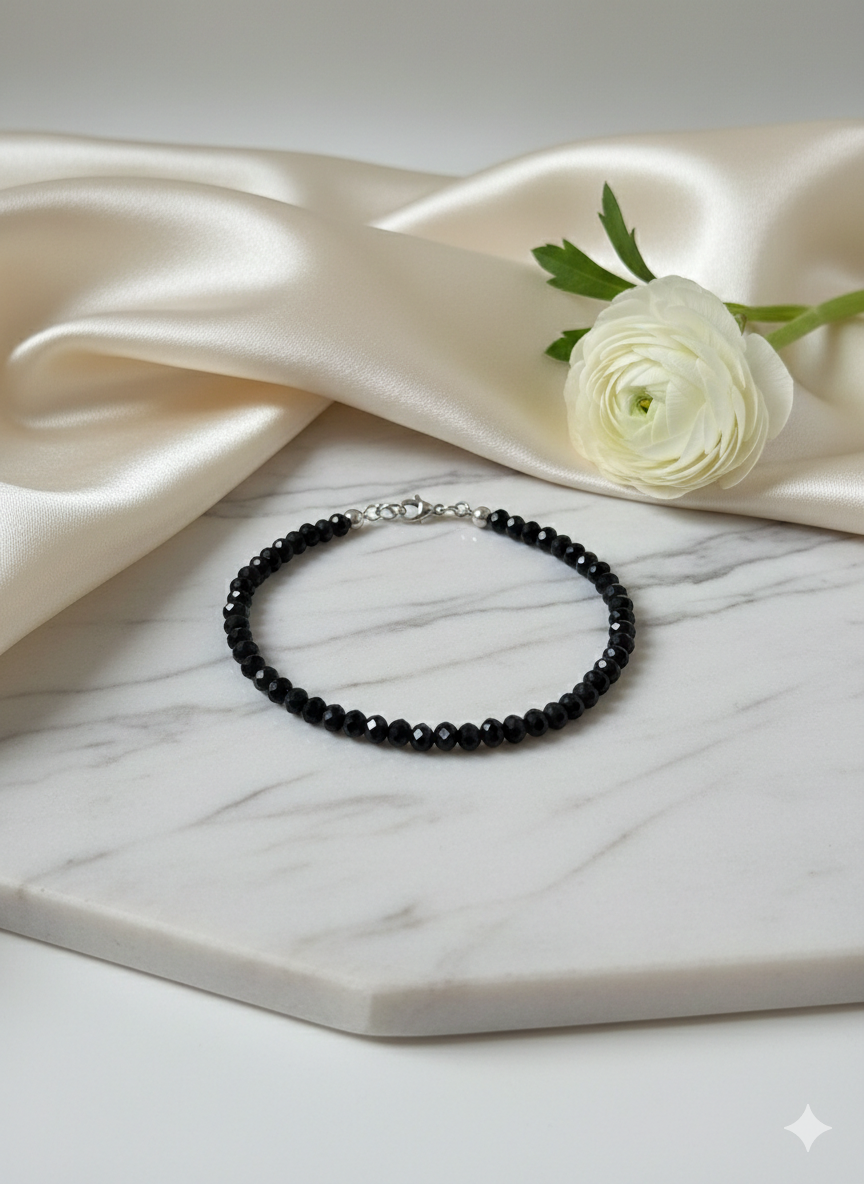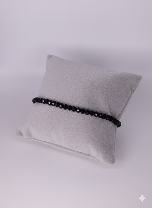 Das Armband besteht aus tiefschwarzen, facettierten Glasperlen, die bei jeder Bewegung das Licht einfangen und dezent reflektieren. Der Verschluss besteht aus rostfreiem Edelstahl.